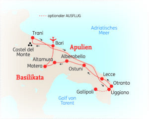 Apulien ist historisch sehr bedeutsam und bietet doch gleichzeitg einen Einblick in das authentische, italienische Alltagsleben. Während dieser 10-tägigen Reise lernen Sie die Höhepunkte Apuliens ebenso wie weniger bekannte, aber genauso beeindruckende Sehenswürdigkeiten kennen. Apulische Spezialitäten dürfen dabei nicht fehlen. Durch zwei Hotelwechsel haben Sie die Möglichkeit, die herrliche Region entspannt und mit Zeit für eigene Erkundungen zu entdecken.