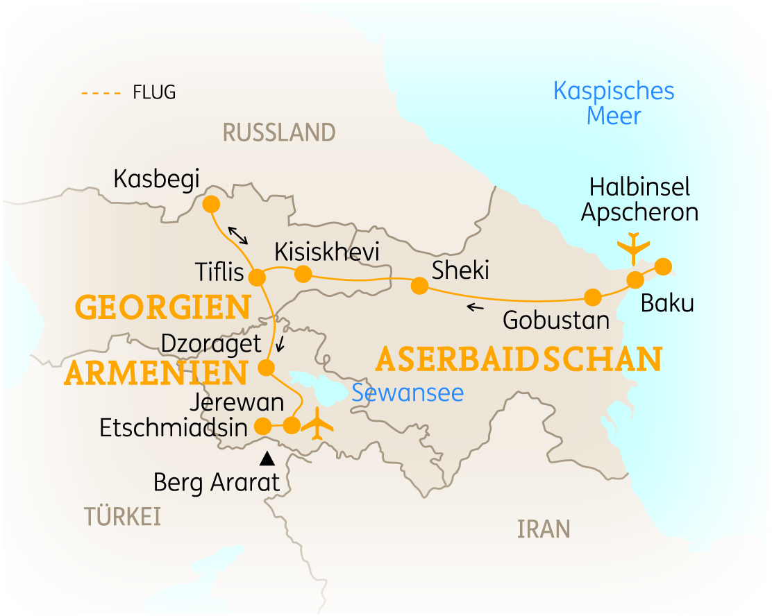 KAUKASUS - Auf dieser 18-tägigen Reise erleben Sie Armenien, Georgien und Aserbaidschan in einem angenehmen Reisetempo. Sie lernen die schönsten Höhepunkte kennen und sind zu Besuch in kleinen Dörfern und bei Familien. Sie übernachten in ausgesuchten Unterkünften, die das Besondere des Ortes unterstreichen: vom zentral gelegenen Boutique- oder modernen Design-Hotel in den Hauptstädten bis hin zum alpinen Berghotel mit Panorama-Blick und stilvollen historischen Hotels in üppigen Wäldern.