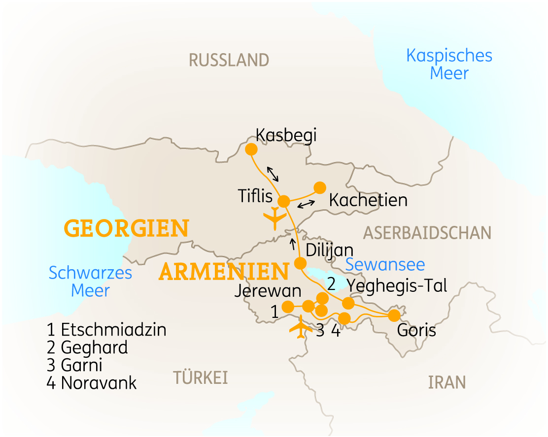 ARMENIEN & GEORGIEN - Erleben Sie in 15 Tagen zwei nahezu unentdeckte Länder im Kaukasus, die Sie mit ihrer fantastischen Bergwelt, der lebendigen Geschichte und Kultur und einer gastfreundlichen Bevölkerung begeistern werden. Auf leichten bis moderaten Wanderungen entdecken Sie einsame, mittelalterliche Klöster und Kirchen vor einer einmaligen Bergkulisse. Sie besuchen die Hauptstädte Jerewan und Tiflis, den Süden Armeniens sowie die Region Kachetien mit dem Lagodechi-Naturschutzgebiet.
