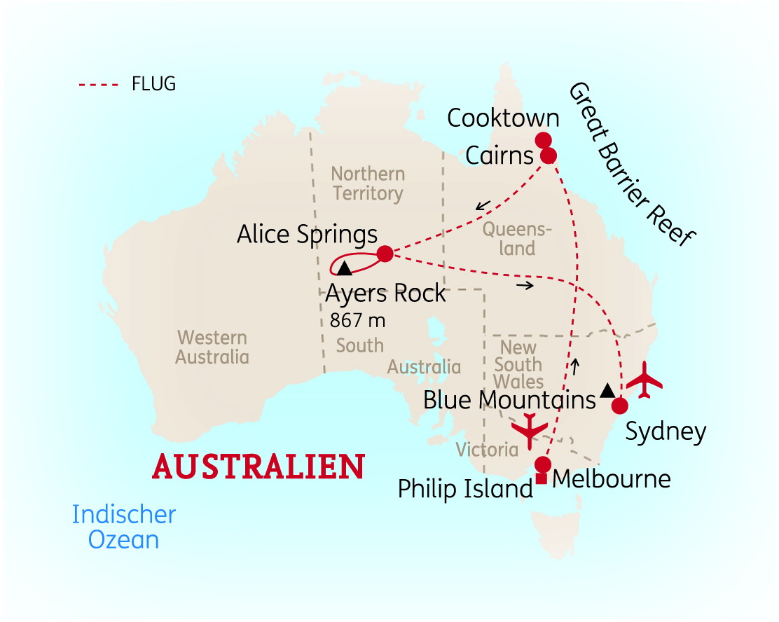 AUSTRALIEN -Erfüllen Sie sich einen Traum und entdecken Sie in 19 Tagen die Höhepunkte des roten Kontinents. Ob Sydney und die Blue Mountains, Melbourne und die Great Ocean Road, das rote Zentrum mit dem Ayers Rock oder Queensland mit seinem tropischen Regenwald und dem Great Barrier Reef – auf dieser Reise erleben Sie die grandiose Vielfalt Australiens und erhalten zudem zahlreiche Einblicke in die faszinierende Kultur der Aborigines.