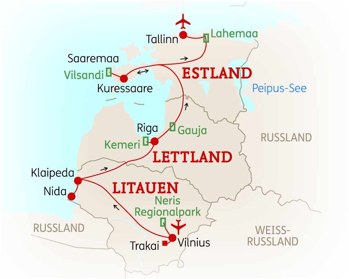 Entdecken Sie auf dieser 11-tägigen, entspannten Wanderreise die drei baltischen Länder! Reizvolle Landschaften, unberührte, wilde Natur und dichte Wälder zeichnen die Natur- und Nationalparks aus. Die überwiegend flachen Regionen bieten ideale Voraussetzungen für eine abwechslungsreiche Wanderreise. Genießen Sie leuchtend-weiße Dünen und Sandstrände, duftende Pinienwälder, klare Seen und Flüsse, rauschende Wasserfälle und dunkle Moore sowie die drei faszinierenden Hauptstädte!
