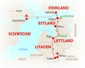 BALTIKUM & SKANDINAVIEN - Diese 10-tägige Reise präsentiert Ihnen die reichhaltige Kultur der baltischen Länder, Finnlands und Schwedens. Eine Mischung aus alten und modernen Bauten sowie skandinavischem Flair erwarten Sie in den fünf Hauptstädten Vilnius, Riga, Tallinn, Helsinki und Stockholm. Nicht weniger interessant sind auch die beiden Nationalparks Gauja und Lahemaa sowie die Inselburg Trakai oder das mondäne Seebad Pärnu. Erleben Sie mit uns einen intensiven Einblick in die Vielfalt der Länder!