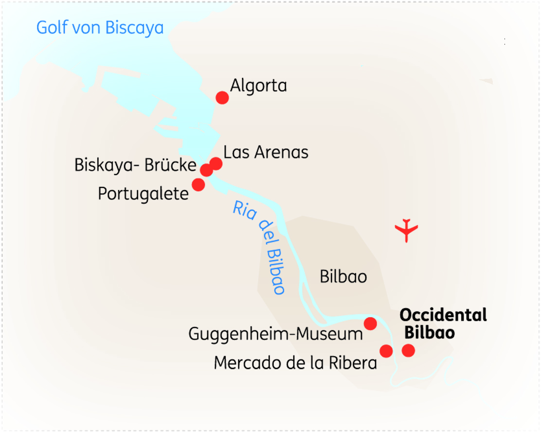 Gerne buchen wir Ihren Flug nach Bilbao (BIO) und zurück ab ca. 300 €, nach Verfügbarkeit. Rail&Fly-Ticket der Deutschen Bahn (nur in Verbindung mit SKR-Flug-Angebot): 85 € (2. Kl.). Vom Flughafen in Ihr Hotel gelangen Sie per Bus, Zug oder Taxi (ca. 20 € pro Strecke). Eine Beschreibung der Fahrt mit öffentlichen Verkehrsmitteln erhalten Sie mit der Buchungsbestätigung. Individueller Transfer gegen Aufpreis möglich.