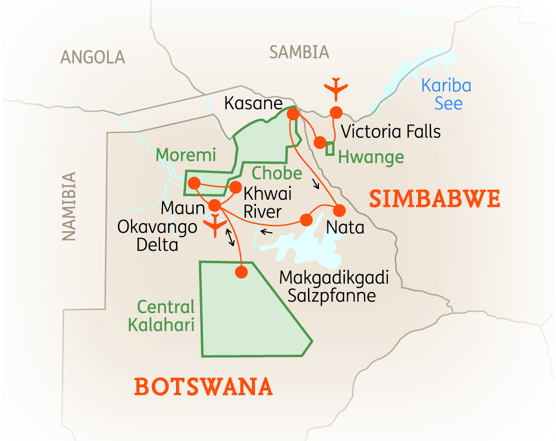 BOTSWANA & SIMBABWE - In 17 Tagen reisen Sie von den gewaltigen Victoriafällen entlang des Sambesi zu den Salzpfannen im Makgadikgadi-Nationalpark. Im Hwange-, Chobe- und Moremi-Nationalpark gehen Sie auf Entdeckungstour und von der endlosen Weite der Kalahari gelangen Sie zum tierreichen Sumpfgebiet des Okavango- Deltas. Freuen Sie sich auf zahlreiche Tierbeobachtungen, Jeep-Safaris und Bootsfahrten, gehen Sie auf die Pirsch mit den Einwohnern der Kalahari und genießen Sie einen Sundowner in den Baobab-Hainen.