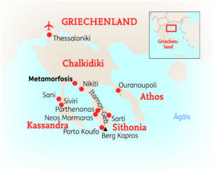 Chalkidiki liegt im Norden Griechenlands und erstreckt sich über die Halbinseln Kassandra, Sithonia und Athos, die wie drei Finger in die Ägäis ragen. Pinienwälder reichen bis an das azurblaue Meer. Einsame Buchten, lange Strände und idyllische Dörfer bilden dazu einen Kontrast. Urige Tavernen an kleinen Fischerhäfen laden zu leckeren Spezialitäten ein. Entdecken Sie auf dieser 8-tägigen Reise eine Region Griechenlands, die ihre Ursprünglichkeit noch weitgehend bewahrt hat.