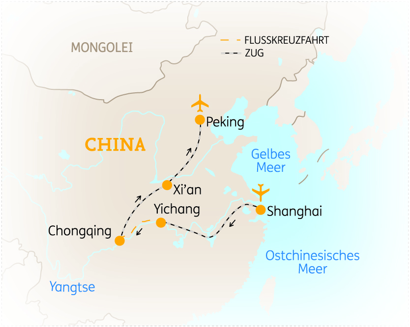CHINA -Diese Rundreise führt Sie von der Wirtschaftsmetropole Shanghai über den mächtigen Yangtze zu den alten Kaiserstädten Peking und Xian. Entdecken Sie in Shanghai moderne Hochhäuser, die Uferpromenade Bund und chinesische Gartenkunst im Yu-Garten. Genießen Sie anschließend bei einer Kreuzfahrt die Landschaft des Yangtze und die Meisterleistungen der Schleusenanlagen. In Xian erwartet Sie die Terrakotta-Armee und in Peking die Verbotene Stadt und die Große Mauer bei Sonnenuntergang.