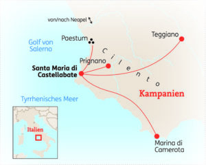 Meer, Schluchten, Berge, mittelalterliche Dörfer – der Cilento ist eine abwechslungsreiche Kulturlandschaft jenseits der großen Touristenströme. Im kleinen Küstenort San Marco di Castellabate erfahren Sie die Entschleunigung des italienischen Lebens. Die goldenen Strände und das mit der „Blauen Flagge“ für seine Klarheit ausgezeichnete Meer laden zur Erholung ein. Genießen Sie Ihre 8-tägige Reise in einer der ursprünglichsten Regionen Italiens!
