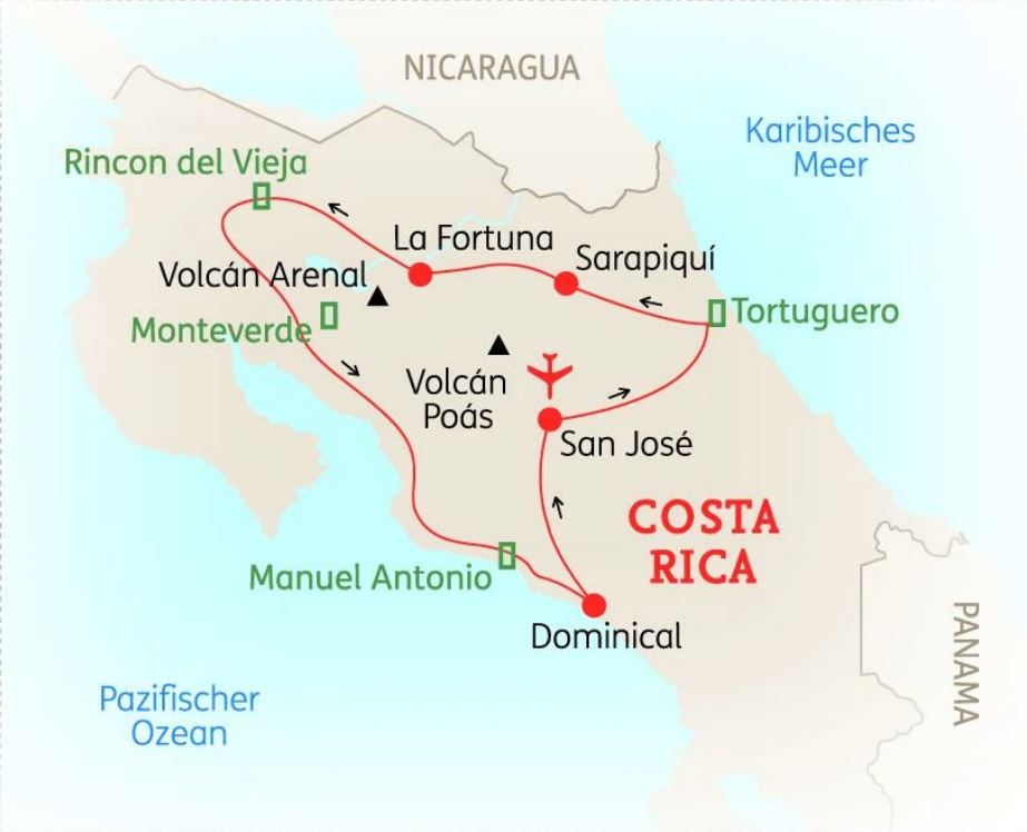 COSTA RICA -Diese 16-tägige Reise führt Sie nicht nur an die traumhafte Pazifikküste, sondern auch in den Urwald der Karibikküste. Neben den schönsten Nationalparks, den vielen Wanderungen mit Tierbeobachtung, bildschönen Stränden und imposanten Vulkanen ist auf dieser Reise das besondere Highlight der Tortuguero-Nationalpark, in dem Sie durch die dicht bewaldeten Kanäle schippern. Den Abschluss der Reise bildet ein Badeaufenthalt zum Erholen und Relaxen.