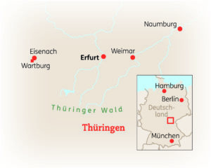 ERFURT & WEIMAR - Thüringens Landeshauptstadt überzeugt mit einer lebensfrohen und entspannten Atmosphäre sowie der schönen und gemütlichen Altstadt mit Domplatz, Fischmarkt, Krämerbrücke und Anger. Mittelalterliche Gassen, verschwiegene Winkel, reich geschmückte Fassaden mit Goldstuck und Fachwerk laden zum Innehalten und Verweilen ein. Erfurt ist zudem ein guter Ausgangspunkt für Ausflüge in die geschichtsträchtigen Städte Eisenach und Weimar.