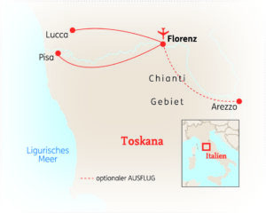 Die lebendige Metropole Florenz liegt im Herzen der strahlenden Toskana und ist der ideale Ausgangspunkt, um die Region zu entdecken. Auf dem Weg nach Lucca oder Pisa durchqueren Sie die weite Hügellandschaft mit sanften Weinbergen und schönen Zypressen-Alleen. Dabei umgehen Sie den hektischen Straßenverkehr und reisen wie die Italiener mit dem Zug. Freuen Sie sich auf eine abwechslungsreiche 8-tägige Reise, bei der Natur- und Kulturliebhaber gleichermaßen auf ihre Kosten kommen.