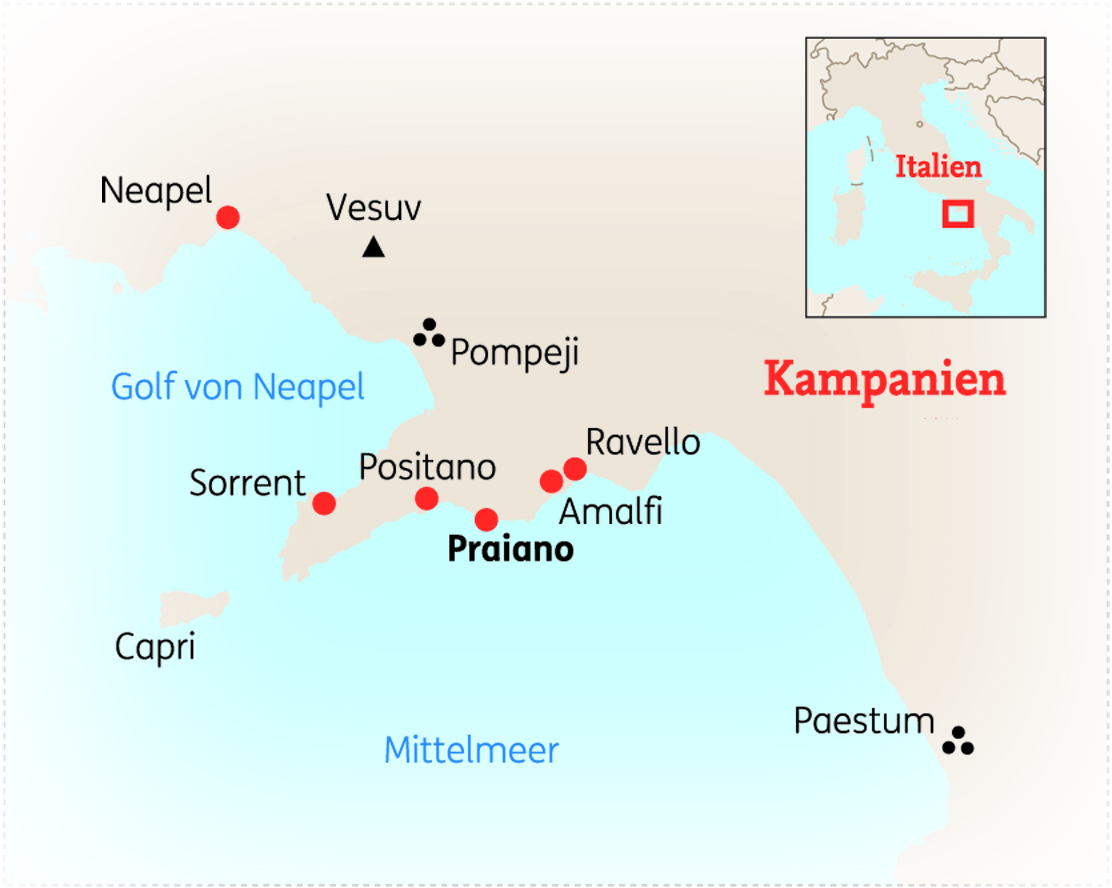 schmiegt sich malerisch an die schroffen Felsen der Amalfiküste. Von jeder Gasse aus haben Sie herrliche Ausblicke auf das Meer und die Felsbuchten. Die Piazza vor der Kirche San Gennaro ist ein beliebter Treffpunkt der Einheimischen. Sie ist vom Hotel in wenigen Gehminuten erreichbar. Am Ortsausgang führen Stufen zum kleinen Hafen und zu einer der Badebuchten am Golf.