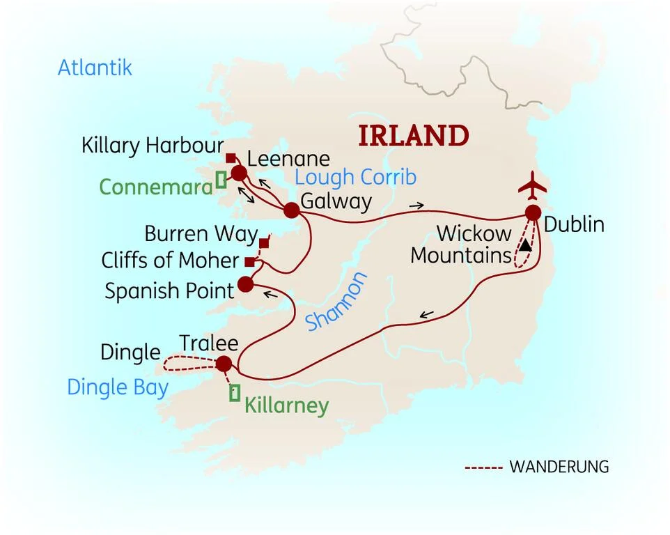 n Ihre Rundfahrt durch den mystischen Burren enthüllt versteckte Schätze. Es ist eine Kalksteinregion, die von Felsformationen, Höhlen, Steinmauern und prähistorischen Überresten geprägt ist. Der Poulnabrone Dolmen, ein beeindruckendes megalithisches Monument, ist ein Fenster in die Vergangenheit. Ihre Wanderung von Feenagh nach Fanore auf dem Burren Way führt durch karge Landschaften und offenbart eine ganz eigene Schönheit. Sie haben genügend Zeit, diese außergewöhnliche Landschaft zu genießen. (moderat, 10 km, Gehzeit ca. 4 Std., +/- 250 Hm). (F/A)