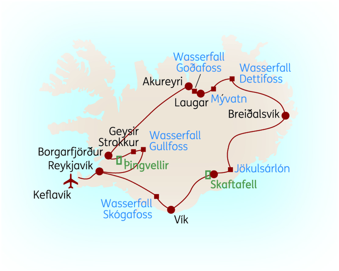 Mitten im Nordatlantik und unmittelbar südlich des Nordpolarkreises gelegen, ist das am dünnsten besiedelte Land Europas ein wahres Naturparadies. Erleben Sie auf Ihrer 8-tägigen Reise atemberaubende Landschaften, heiße Thermalquellen, aktive Vulkane, imposante Gletscher und rauschende Wasserfälle sowie brodelnde Schwefelquellen und Geysire. Lassen Sie sich entführen in die Welt der Trolle und Elfen!
