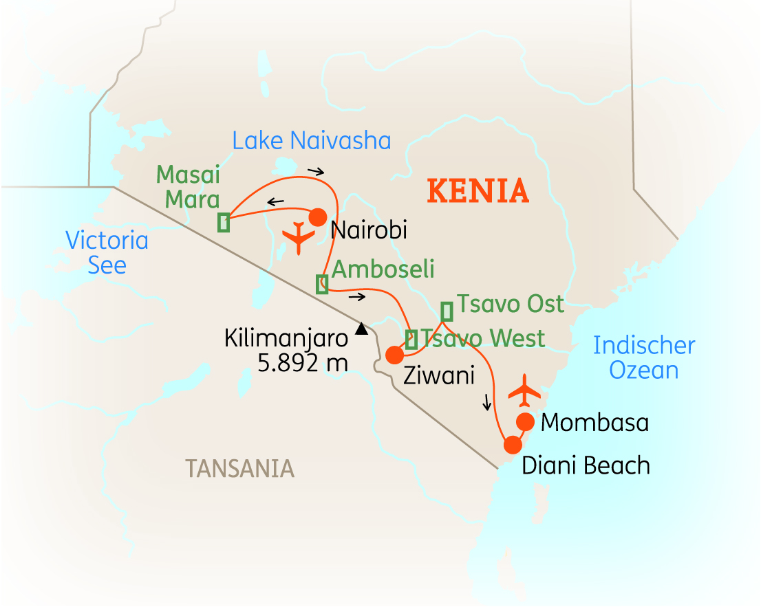 KENIA - Lernen Sie in 16 Tagen das vielfältige Land in Ostafrika kennen. Kenia bietet eine aufregende Kombination aus malerischen Landschaften und einer faszinierender Tierwelt. Freuen Sie sich auf die „Big Five“ sowie andere Wildtiere in den Nationalparks während einer Ihrer zahlreichen Safaris. Wer mag, kann bei einer Heißluftballonfahrt über die Masai Mara gleiten und eine ganz andere, einzigartige Perspektive erleben.