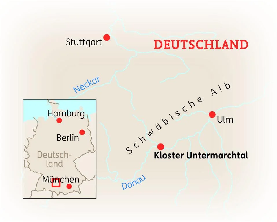 Per Bahn über den ICE-Bahnhof Ulm zum Bahnhof Munderkingen, Weiterfahrt mit dem Linienbus Richtung Riedlingen. Gerne organisieren wir Ihre Abholung vom Bahnhof Munderkingen. Bitte geben Sie dies bei Buchung an. Für Pkw-Anreisende befinden sich kostenfreie Parkplätze am Kloster. Nähere Hinweise erhalten Sie mit der Buchungsbestätigung.