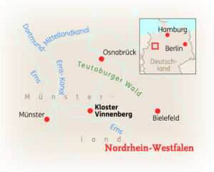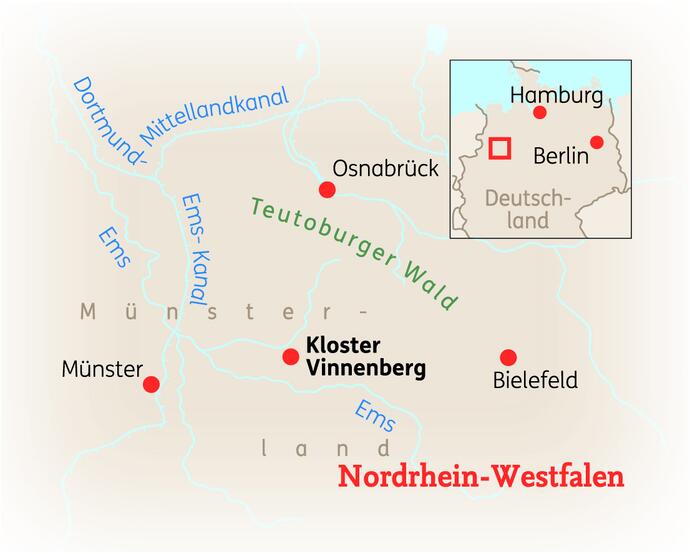 KLOSTER VINNENBERG - Der geistliche Ort Kloster Vinnenberg gilt als der älteste Marienwallfahrtsort des Bistums Münster und ist der ideale Ort für alle diejenigen, die Besinnung und Stille suchen. Seit nun mehr als 750 Jahren trägt das Kloster den Namen des ehemaligen Adelshofs Vinnenberg. In den letzten 100 Jahren lebten hier Benediktinerinnen, die aufgrund von Alter und Krankheit ihr Kloster verlassen mussten. Heutzutage beherbergt das Kloster Gäste von überall her und dient als Ort der geistlichen Begegnung.