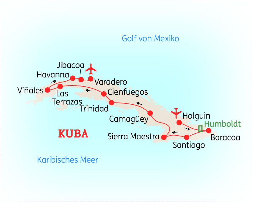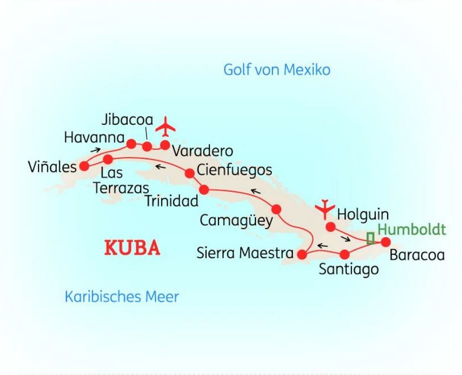KUBA - Auf dieser Reise lernen Sie in 21 Tagen die gesamte Insel ausführlich kennen. Neben den schönsten Kolonialstädten und klassischen Highlights entdecken Sie bei einer Wanderung außerdem die grüne Vielfalt der Sierra Maestra, stoppen an der legendären Schweinebucht und haben viel Zeit für eigene Erkundungen, u.a. in Trinidad, Viñales und Havanna. Den Abschluss der Rundreise bildet der dreitägige Badeaufenthalt am Traumstrand von Jibacoa, den Sie zum Relaxen und Entspannen nutzen können.