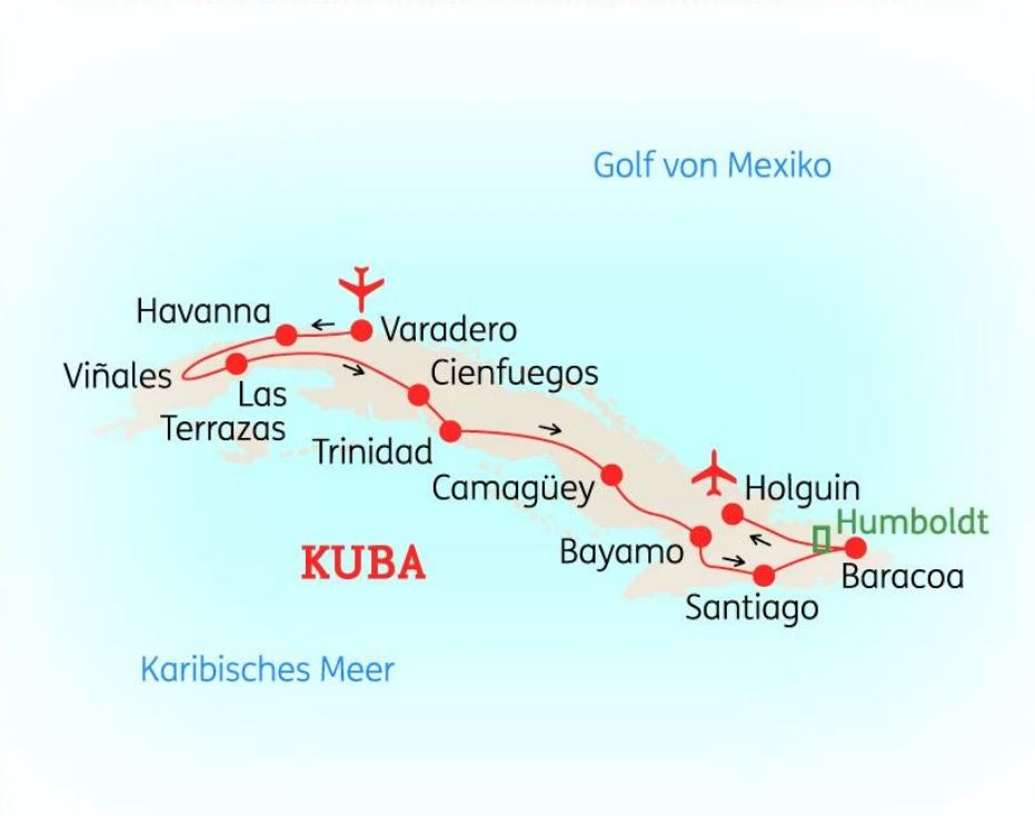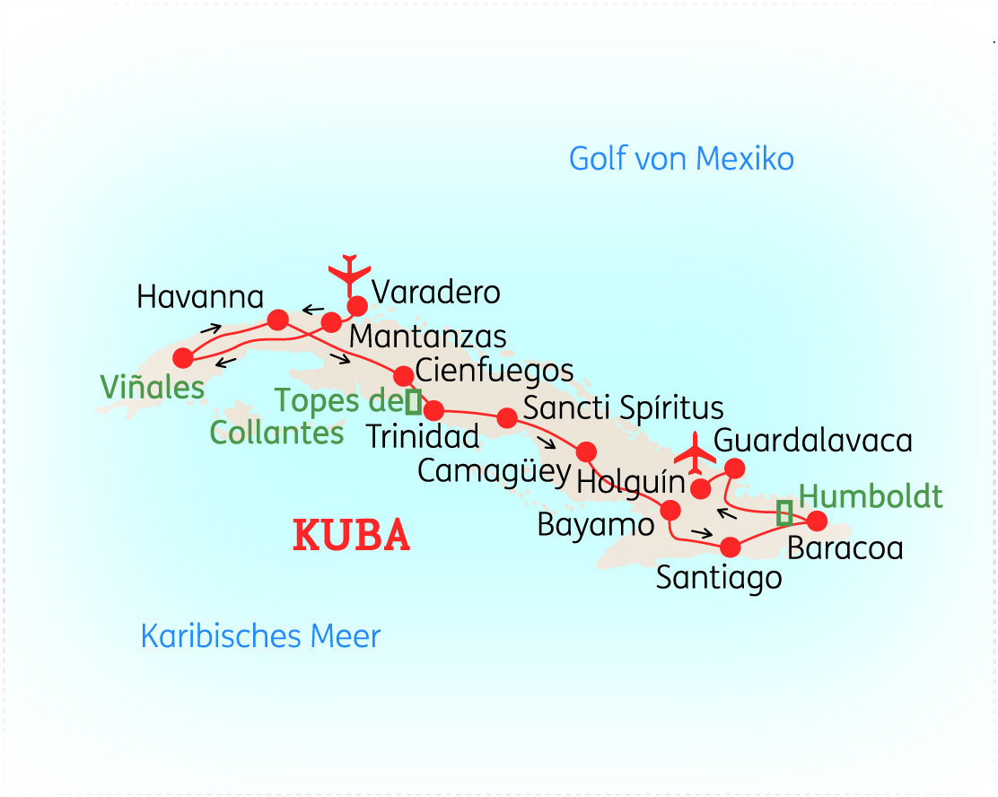 KUBA - Bunte Oldtimer, von kolonialer Architektur geprägte Städte und Pferdekarren als Lastentransport; dazu der Stolz, die Herzlichkeit und die Lebensfreude der Kubaner – Kuba überzeugt durch seine Schlichtheit, das Lebensgefühl und die aufregenden Einblicke in das Gestern und das Morgen. Auf dieser 18-tägigen Erkundungstour reisen Sie von Havanna im Westen bis nach Holguín im Osten. Am Ende Ihrer Reise verbringen Sie entspannte Tage in einem Strandhotel an einem der Traumstrände von Guardalavaca.