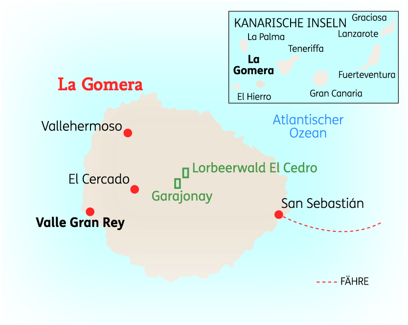 Durch das ganzjährig angenehme Klima mit sommerlichen Temperaturen sowie der bezaubernden Landschaft ist La Gomera ein ideales Ziel für Naturliebhaber und Wanderfreunde. Grüne Terrassenfelder, farbenfrohe Gärten und weiße Häuschen finden sich im Valle Gran Rey, dem „Tal des Königs“. Spazieren Sie über die palmengesäumte Promenade, entdecken Sie die typischen Holzbalkone, bummeln Sie durch die Geschäfte oder genießen Sie in den Restaurants Tapas. Ruhesuchende finden hier idyllische Plätze und eine entspannte Atmosphäre. Linienbusse fahren regelmäßig in die umliegenden Bergdörfer und die Inselhauptstadt San Sebastián.