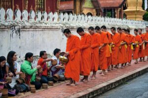 Heute lohnt es sich, früh aufzustehen! Hunderte Mönche verlassen mit ihren safranfarbenen Roben die Klöster und begeben sich auf ihren morgendlichen Almosengang. Nach dem Frühstück fahren Sie auf dem Mekong zu den Höhlen von Pak Ou, in denen sich Tausende von Buddha-Statuen befinden. Auf dem Rückweg besuchen Sie ein Dorf, in dem Sie zuschauen können, wie der lokale Reisschnaps „Lao-Lao“ traditionell destilliert wird. (F)