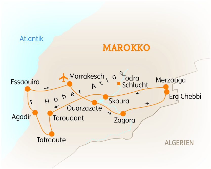 SÜDMAROKKO - Auf dieser 12-tägigen Reise entdecken Sie die spektakulärsten Landschaften Marokkos! Fahren Sie über den höchsten Pass, durchqueren Sie das Draa-Tal mit den unendlichen Dattelhainen und den prachtvollen Kasbahs. Lassen Sie sich den Wind an der Atlantikküste um die Nase wehen und rieseln Sie den Wüstensand durch Ihre Finger, der im Kontrast zu den schneebedeckten Bergen des Atlasgebirges steht. Mit dem mystischen Marrakesch erwartet Sie dann am Ende ein Feuerwerk an Eindrücken!
