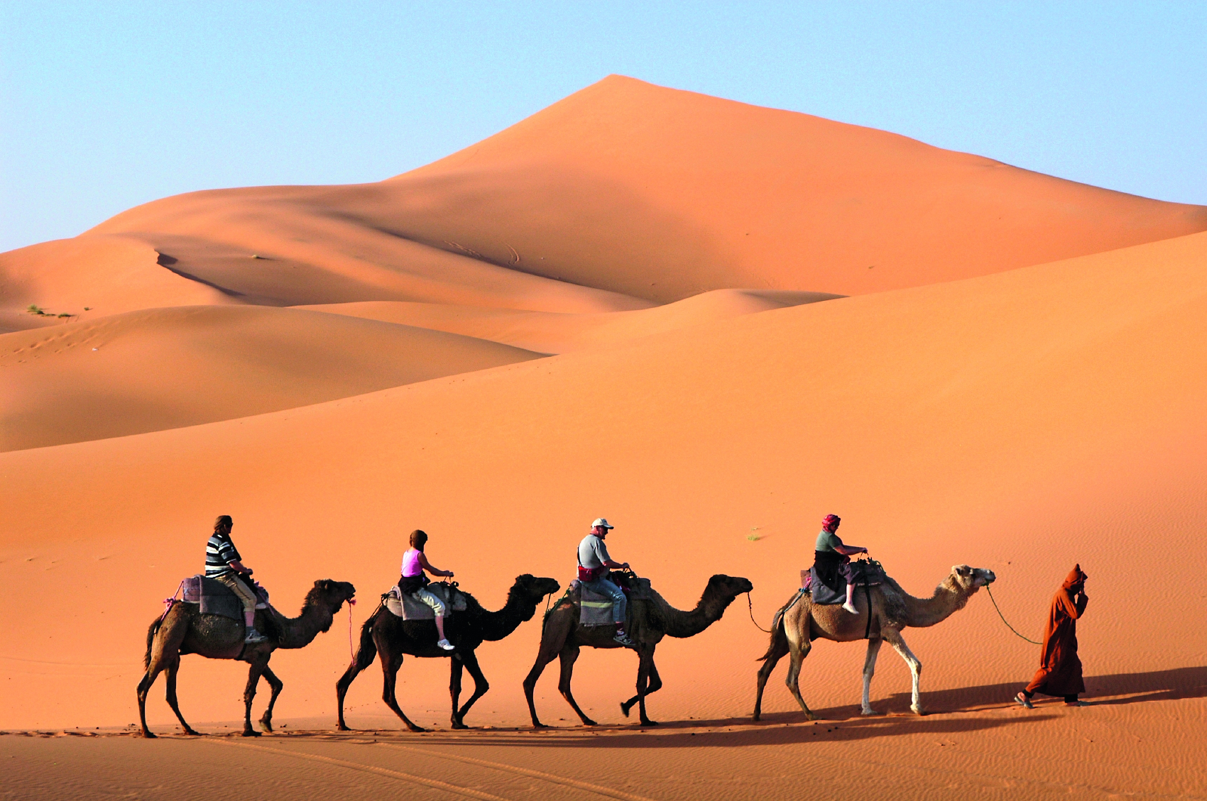 Sie besuchen heute in der Kleinstadt Zagora den Wochenmarkt. Die Berber aus der Region kommen hierher, um ihre Waren anzubieten. Mischen Sie sich unter das Volk und beobachten Sie das exotische Treiben – ein wunderbares Durcheinander! Sie verlassen die Dattelpalmen- Oase in Richtung Nkoub und Alnif. Je nach Jahreszeit können Sie die Halbnomaden mit ihren Herden sehen. Auf dem Weg zu den Ausläufern der Sahara passieren Sie großartige Landschaften, bis am Horizont bereits die Sanddünen des Erg Chebbi zu erkennen sind. Ein Kamelritt bringt Sie in Ihr Zeltcamp, das mit Betten, Matratzen und Decken ausgestattet ist. Erleben Sie bei gutem Wetter einen einmaligen Sonnenuntergang und eine unvergessliche Nacht unter einem atemberaubenden Sternenhimmel. 1 Nacht in einem einfachen Wüstencamp. (F/A)