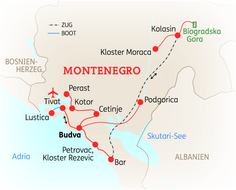 MONTENEGRO -Die „Perle der Adria“, wie Montenegro auch genannt wird, wartet mit vielseitiger Natur, reicher Geschichte und charmanten Städten auf. Gebirgige Abschnitte, luftige Küstenorte und artenreiche Seen wollen ebenso von Ihnen erkundet werden, wie die historischen Orte Cetinje und Kotor. Erleben Sie auf dieser 8-tägigen Reise eine spannende Mischung aus Kultur und Natur gepaart mit lokalen Spezialitäten.