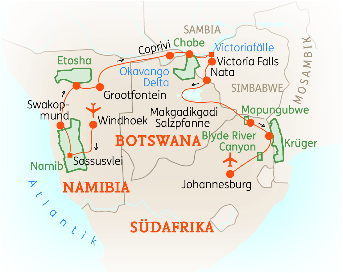 SÜDLICHES AFRIKA -Kombinieren Sie die schönsten Nationalparks in Namibia, Südafrika und Botswana mit den Victoriafällen in Simbabwe! In 21 Tagen bereisen Sie die besten Orte zur Tierbeobachtung, besuchen Schutzprojekte und soziale Initiativen und sehen die landschaftliche Vielfalt des Südlichen Afrikas – vom wasserreichen Caprivi-Streifen, über die donnernden Victoriafälle in Simbabwe und die trockene Savanne Botswanas, bis hin zum atemberaubenden Blyde River Canyon!