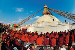 Freuen Sie sich auf weitere UNESCO Weltkulturerbestätten des Kathmandu-Tals. Stehen Sie in Bodnath vor der 40 Meter hohen buddhistischen Stupa und beobachten Sie andächtig die Gläubigen, die die Stupa umrunden und dabei das Gebet „Om mani padme hum“ murmeln. In einem nahe gelegenen Kloster erwartet Sie eine Audienz bei einem Mönch. Interessantes über die religiöse und spirituelle Fertigkeit des Malens von Thankas und Mandalas erfahren Sie beim Besuch einer Akademie für Künste. Eine ganz andere Welt erwartet Sie in Pashupatinath. Das bedeutendste hinduistische Shiva-Heiligtum und Verbrennungsstätte in Nepal ist Ziel zahlreicher Pilger und Sadhus. Am Abend findet Ihr traditionelles, nepalesisches Abschiedsessen statt. (F/A)