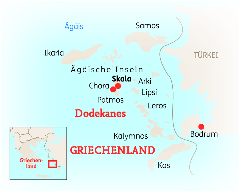 PATMOS - Patmos ist eine Perle in der Ägäis und unerschöpflich im Wechsel der Landschaft: Mittelmeersonne, steile Hänge, unzählige Kapellen, Einsiedeleien und Klöster, traumhafte Ausblicke von den Hügeln über Buchten, das blaue Meer und die umliegenden Inseln. Auf der 15-tägigen Reise erwarten Sie Palmen, Ölbäume, Feigen, Zitrusfrüchte, Blumen sowie Begegnungen unterwegs mit den wenigen Bauern der Insel. Ein Bild von einzigartiger und seltener Schönheit wird unvergessliche Eindrücke hinterlassen!