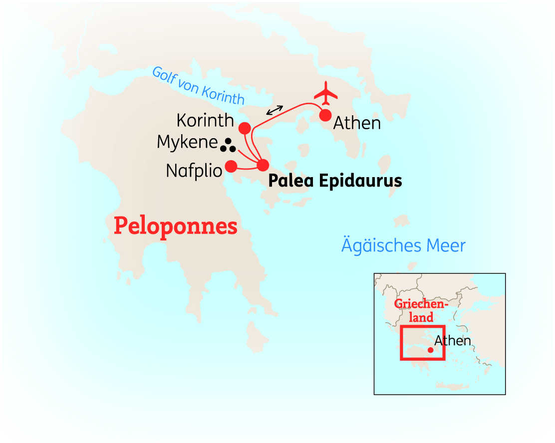 Vor Ort können Sie gegen Aufpreis bei Ihrem Reiseleiter einen Ausflug u.a. nach Korinth und Akrokorinth buchen. Zudem bietet Ihr Reiseleiter das Paket „Wandern in der Argolis“ (außer an den Terminen 09.06.2024 und 23.06.2024) an. Auf zwei Ganz- und zwei Halbtagswanderungen (bis zu 4 Std.) lernen Sie die Landschaften und Orte der Region kennen. Erforderlich sind eine normale Grundkondition und Wanderschuhe. Die Wanderungen des Pakets können auf Anfrage auch einzeln gebucht werden.