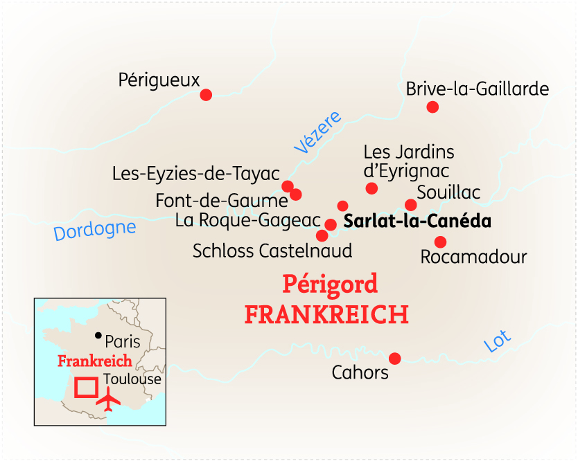PÉRIGORD / DORDOGNE - Sanft schlängelt sich die Dordogne durch die Eichen- und Pinienhügel des Périgords, auf denen Burgen und Schlösser als stille Zeitzeugen des Mittelalters thronen. Neben der geschichtlichen und kulturellen Vielfalt kommen auf dieser 8-tägigen Reise auch die Gaumenfreuden nicht zu kurz: Das milde Klima bringt aromatische Trüffel, saftige Walnüsse und vollmundige Weine hervor, welche untrennbar mit der Region verbunden sind. Eine Reise, die alle Sinne anregt und ausreichend Zeit für Genuss bietet!