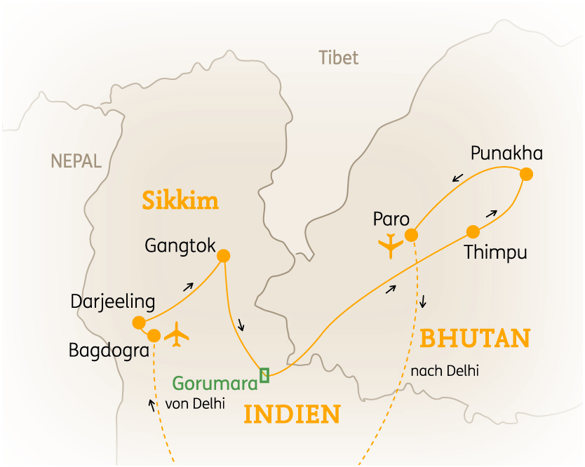 Erwarten Sie in Sikkim und Bhutan, die sich gerade behutsam dem Tourismus öffnen, nicht immer eine perfekte, dem europäischen Standard entsprechende Ausstattung. Die Straßen sind teilweise in einem schlechten Zustand, sodass manche Überlandfahrten anstrengend sein können. An einigen Terminen besuchen Sie zusätzlich traditionelle Klosterfeste in Bhutan (siehe Termintabelle). Bitte beachten Sie, dass der Programmablauf dieser Termine geringfügig abweichen kann, damit Sie die Klosterfeste bestmöglich miterleben können.