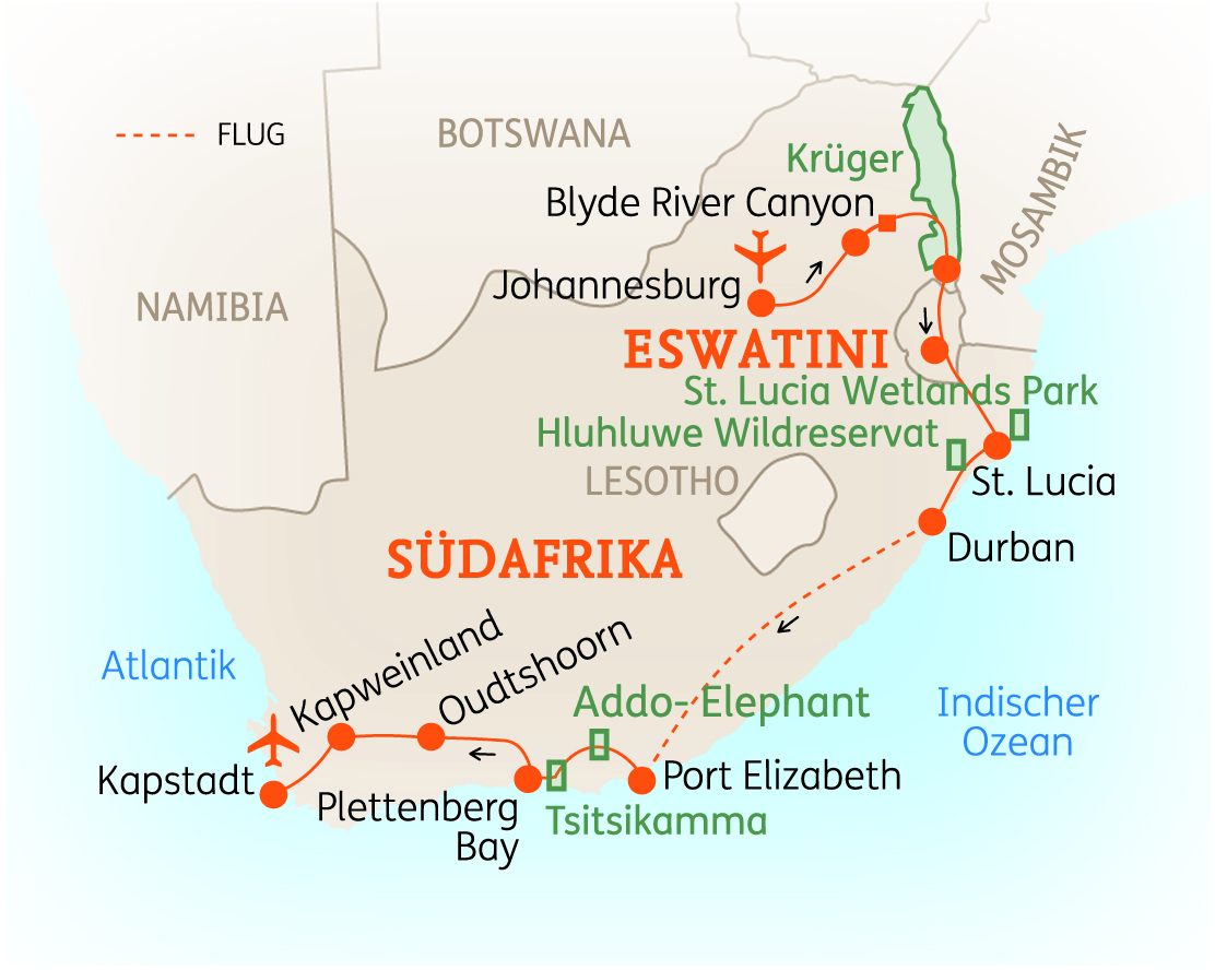 SÜDAFRIKA -Erleben Sie Südafrika in einem angenehmen Reisetempo! In 18 Tagen lernen Sie die Regenbogennation intensiv kennen und freuen sich über die zusätzliche Zeit, um bei Wanderungen oder Spaziergängen die herrliche Landschaft zu genießen und die beeindruckendsten Orte auf sich wirken zu lassen. Für Ihre Urlaubserholung sorgen eingeplante Pausen in malerischen Städtchen an der Gardenroute, ein Entspannungstag in Plettenberg Bay und regelmäßige Freizeit für Ihre eigenen Pläne.