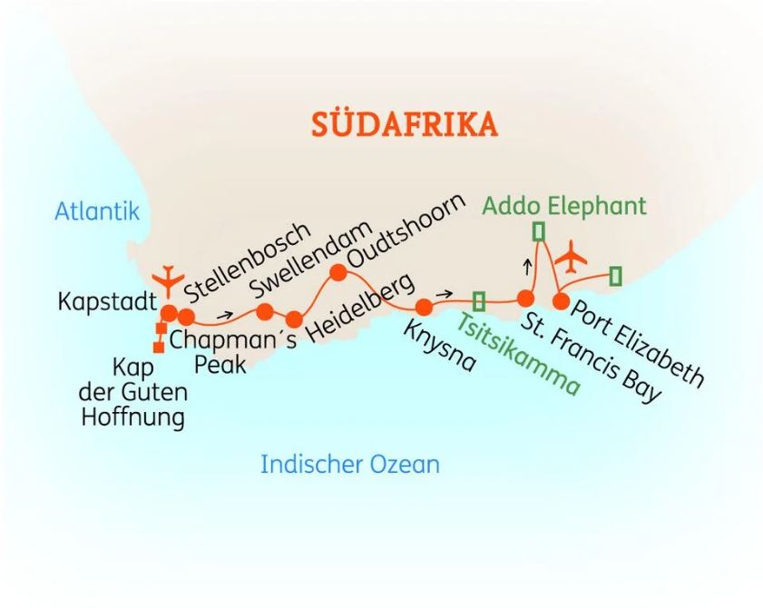SÜDAFRIKA-Erleben Sie während Ihrer 15-tägigen Rundreise die Metropole Kapstadt mit dem Kap der Guten Hoffnung sowie die atemberaubend schöne Landschaft und einzigartige Tierwelt entlang der berühmten Gardenroute auf einer malariafreien Reiseroute. Mit etwas Glück sehen Sie die „Big Five“, Löwe, Nashorn, Elefant, Büffel und Leopard, oder die Wale in Hermanus. Freuen Sie sich auch auf erlesene Kap- Weine, charmante Städtchen und Stranderholung.