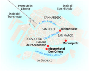 Mit der schnellen Bahnverbindung von Montegrotto fahren Sie direkt ins Zentrum. Ein Spaziergang führt durch verwinkelte Gassen, vorbei an berühmten Palästen und Brücken des Canal Grande, zum Markusplatz mit Dom und Dogenpalast. Anschließend bleibt ausreichend Zeit für persönliche Entdeckungen. Besuchen Sie die Kirche Santa Maria della Salute, bewundern Sie die prachtvolle Ausstattung der Markusbasilika oder gönnen Sie sich einen Cappuccino in einem der berühmten Kaffeehäuser. Am Nachmittag fahren Sie mit dem Linienschiff über den Canal Grande zurück zum Bahnhof und genießen noch einmal den Blick auf die kunstvollen Fassaden der Paläste. Ein weiterer Vorteil der Bahnreise: die Rückreise nach Montegrotto kann unabhängig von der Gruppe gestaltet werden (Bustransfer von Abano nach Montegrotto und zurück nur in Verbindung mit der Gruppe, ansonsten individuell). (F/A)