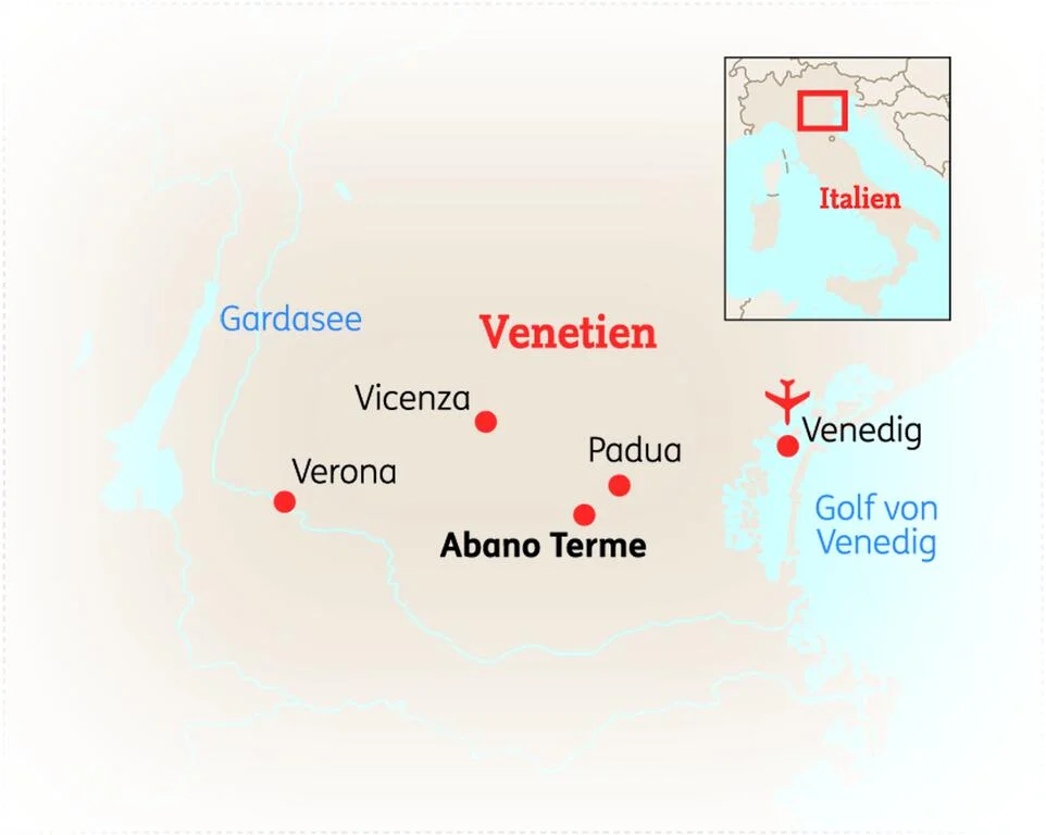 Verpflegung: Im Preis enthalten ist Halbpension. Das Frühstücksbuffet wird im Frühstückssaal mit Blick auf die Euganeischen Hügel serviert und umfasst ein Angebot aus herzhaften und süßen Speisen. Am Abend, bzw. an den Tagen der Opernbesuche am Mittag, erwartet Sie ein wechselndes, reichhaltiges Menü mit regionalen und internationalen Spezialitäten. Die Vorspeise können Sie sich am Buffet aussuchen, den Hauptgang wählen Sie aus einem Menüvorschlag.