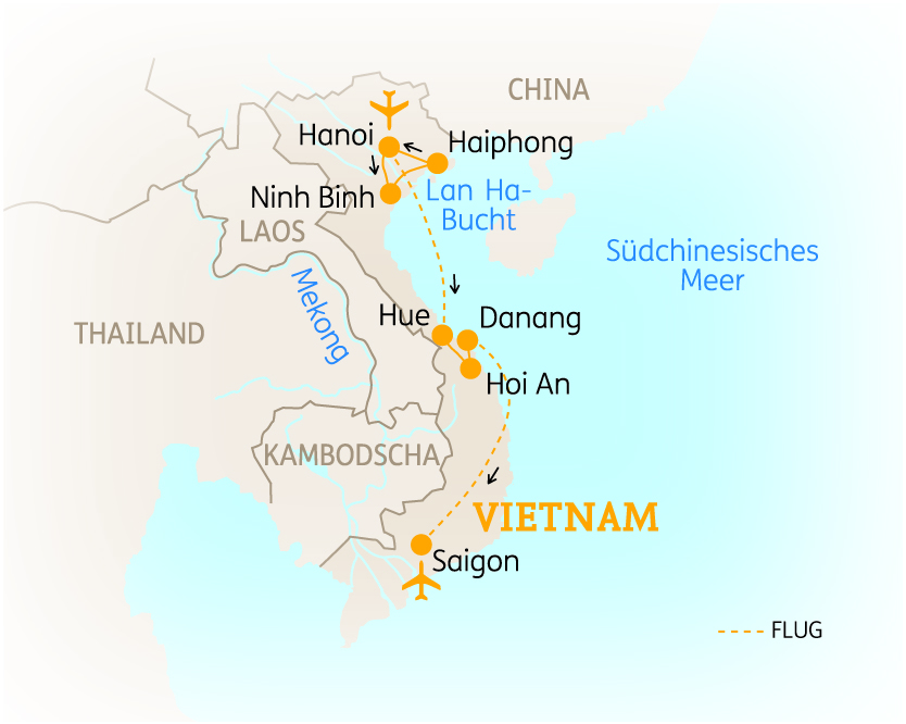 VIETNAM - Den Rahmen dieser 14-tägigen Reise bilden der Besuch der traditionellen Haupstadt Hanoi und der weltoffenen Metropole Saigon, unterwegs erleben Sie faszinierende Landschaften und kulturelle Schätze im Überfluss. Neben den klassischen Höhepunkten erwartet Sie im reizvollen Zentrum Vietnams zwischenzeitlich etwas Zeit für Muße. Genießen Sie ein paar Tage der Ruhe und Entspannung in Ihrem Strandresort im charmanten Hoi An, bevor Sie den faszinierenden Süden Vietnams erkunden!