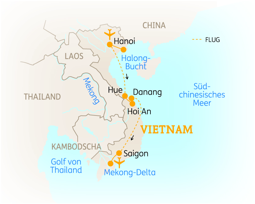 VIETNAM - Bei dieser kompakten 11-tägigen Rundreise durch Vietnam erleben Sie die Höhepunkte dieses faszinierenden Landes in Indochina. In Hanoi und Saigon warten die pulsierenden und quirligen Altstädte auf Sie. Lassen Sie sich zudem von historischen Pagoden und Tempeln sowie reizvollen Landschaften wie der malerischen Halong-Bucht in den Bann ziehen. Erleben Sie ein Land im Wandel der Zeit – das alte und das neue Vietnam in einer dynamischen Aufbruchstimmung!