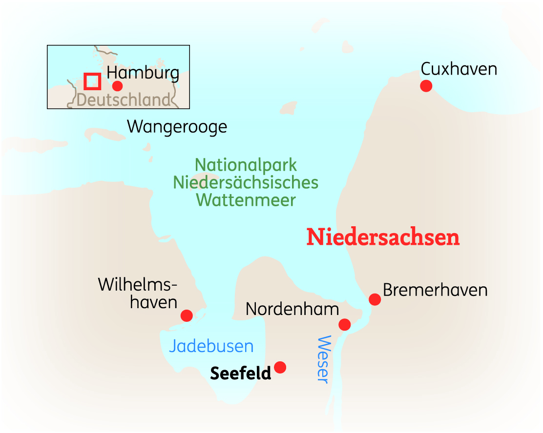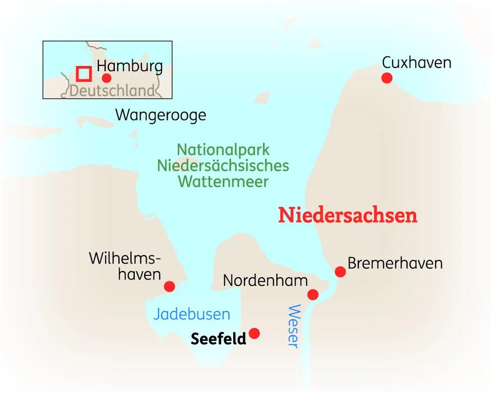 Das Landschaftsbild der Region rund um den Nationalpark am Wattenmeer ist geprägt durch endlose Wiesen, grasende Tiere, reetgedeckte Bauernhäuser, alte Windmühlen und romantische Häfen. Ihr Urlaubsort Seefeld liegt am Jadebusen, einer Meeresbucht mitten im Marschenland. Fernab vom Alltagstrubel genießen Sie den ausgewählten Kurs in einer verträumten Oase der Ruhe mit großem Park und altem Baumbestand.