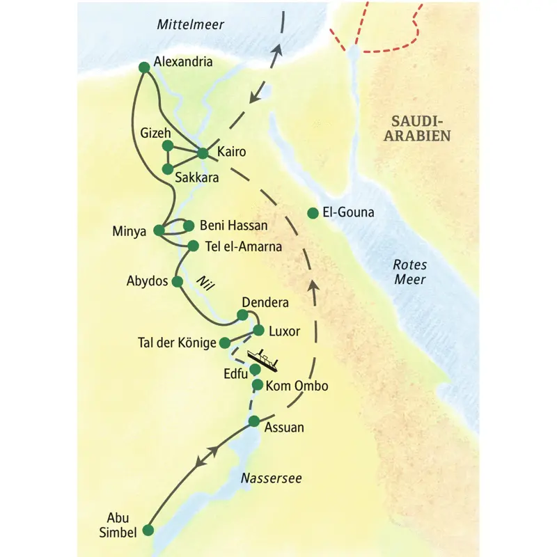 Die großen Wunder Ägyptens von Alexandria bis Abu Simbel: In Alexandria betreten Sie die Bibliothek, vor den Pyramiden von Gizeh stehen Sie und schauen zum riesigen Sphinx empor. Nur bei dieser Reise bringen wir Sie auch nach Mittelägypten zur Echnaton-Stadt Tel el-Amarna und nach Abydos. Fühlen Sie die Ewigkeit in den Tempeln von Karnak und Luxor! Ihre Reiseleiterin führt Sie zu mystischen Tierkulten und verschafft Zugang zur Götterwelt des alten Ägyptens. Dazu eine Runde auf einer traditionellen Feluke, ein Gang durchs Tal der Könige und einen ganzen Tag in Abu Simbel. Fügen Sie Augenblicke voller Rätsel und Erhabenheit zu Ihrem persönlichen Ägyptenbild! Es ist ein Souvenir fürs Leben.