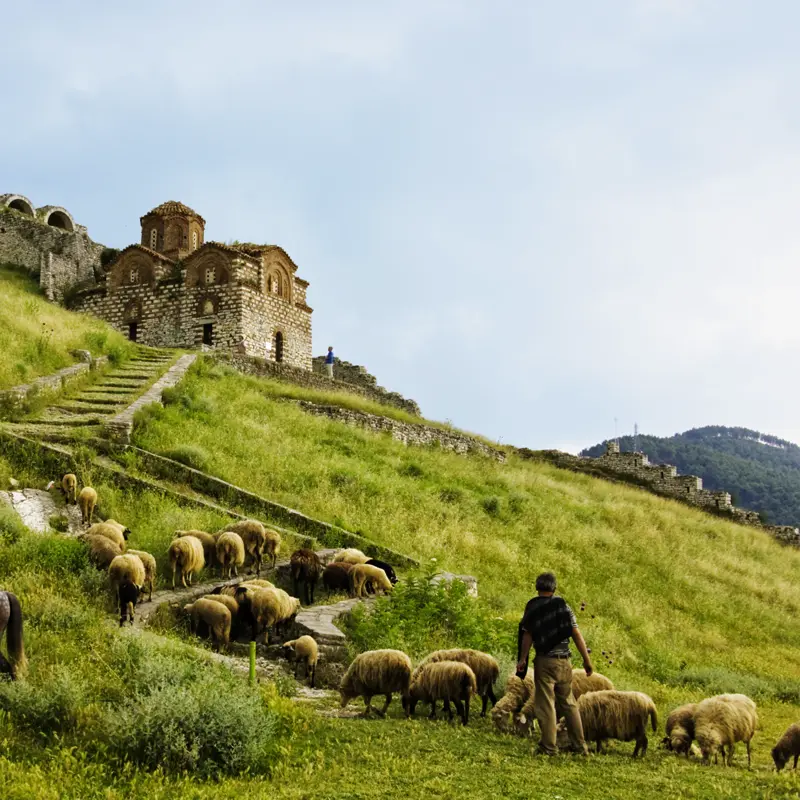 Eine einsam gelegene alte Kirche, die Ruinen eines Wehrklosters – Ihr Reiseleiter entführt Sie an einen melancholischen Platz und erzählt passend zur Stimmung des Ortes eine albanische Legende. Dann schlängeln wir uns über Pässe und durchs Drinotal nach Gjirokastra (UNESCO-Welterbe). Treppauf, treppab spazieren wir dort in der Altstadt vorbei an traditionellen Steinhäusern, die an kleine Festungen erinnern. Im Geburtshaus von Ex-Diktator Hoxha blicken wir in die Vergangenheit, von der Burg anschließend auf Kirchen, Moscheen und die Bergwelt ringsum. In der Kleinstadt Permet klingt der Tag in einem urigen Restaurant genüsslich aus. 110 km. (F, A)