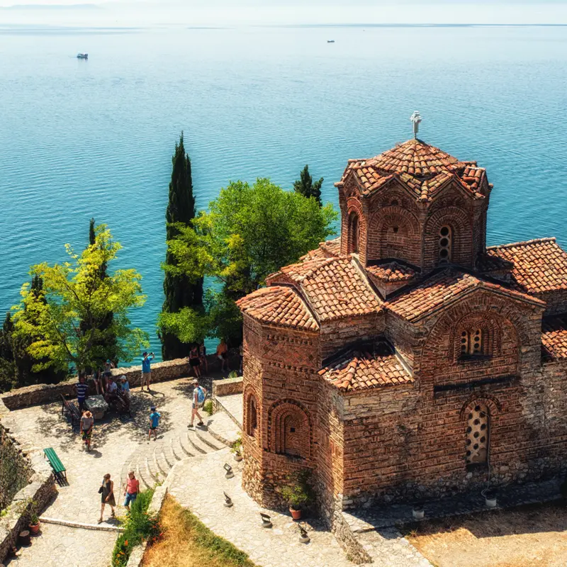 Die Fahrt durchs einsame Vjosatal und die raue Bergwelt untermalt Ihr Reiseleiter mit Kostproben albanischer Dudelsackmusik. In Korca bleibt Zeit, die Füße zu vertreten oder in ein Straßencafé einzukehren, bevor es über die Grenze nach Nordmazedonien geht und dort ins Kloster Sveti Naum, das am Ufer des Ohrid-Sees thront. Auf der Fahrt nach Ohrid berichtet Ihr Reiseleiter vom lange währenden Namensstreit mit Griechenland, der mit der in beiden Ländern umstrittenen Kompromisslösung Nordmazedonien endete. 210 km. Zwei Übernachtungen in Ohrid. (F, A)