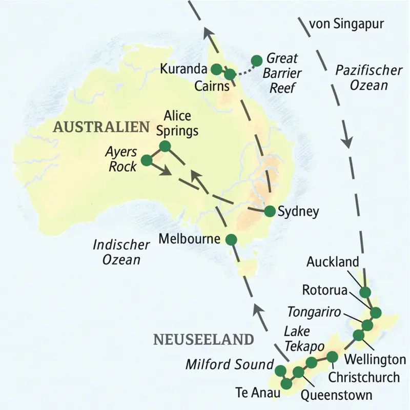 - Linienflug mit Singapore Airlines (Economy, Tarifklasse G) von Frankfurt nach Auckland und zurück von Cairns, nach Verfügbarkeit