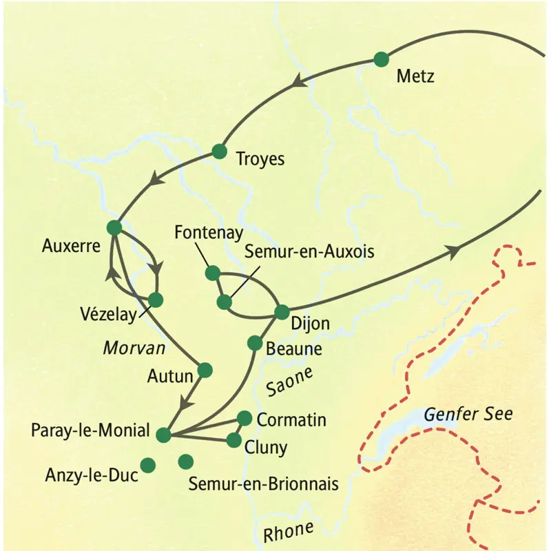Zum Abschluss nochmals ein Kapitel Bilderbuch-Burgund: Im Morgenlicht liegt, versteckt im Wald, die Abtei Fontenay (UNESCO-Welterbe) vor uns – ein stiller Platz mönchischer Versenkung, der niemanden unberührt lässt. Auf unserer Weiterreise durchs nördliche Burgund begleiten uns sanfte Hügel, Wiesen, Weinberge und kleine Dörfer wie das bildhübsche Semur-en-Auxois. Hier können Sie durch die mittelalterliche Altstadt promenieren und die vielen kleinen Läden durchstöbern. Zum Abendessen ist in Dijon in einem typischen Restaurant der Tisch für uns gedeckt, und gemeinsam nehmen wir Abschied vom Burgund. 180 km. (F, A)