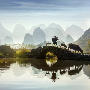 Bambus, Wasserbüffel und Reisfelder säumen unsere Flussfahrt auf dem Li. Unser Ziel ist das Städtchen Fuli, wo Sie wundervoll bemalte Papierfächer finden. Der Bus bringt uns zurück nach Yangshuo. 40 km. Den Rest des Tages gestalten Sie spontan. Auf einem Floß über das Flüsschen Yulong staken lassen? Abends die spektakuläre Show "Liu Sanjie" (ca. 40 €) miterleben, die den Fluss zur Bühne macht und die beleuchteten Karstberge zur Kulisse? (F, M)