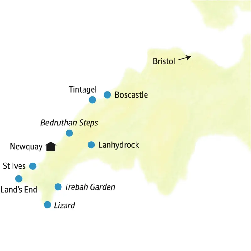 Dramatisch thront die Burgruine von Tintagel hoch auf dem Felsen über dem Meer. Ein Platz für Mythen und Legenden, den wir über einen steilen Weg für uns erobern. Ob König Artus hier tatsächlich das Licht der Welt erblickte? England wie aus der Filmkulisse: das Dorf Boscastle nebenan. Die Kehrseite der Landschaftsidylle: Von hohen Arbeitslosenzahlen in der strukturschwachen Region berichtet Ihr Reiseleiter. Der Rest des Tages gehört Ihnen! Zeit für Strandspaziergänge. Oder Sie schmökern sich durch den Nachmittag. (F)