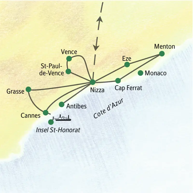 Mit azurblauem Funkeln bezirzt die französische Riviera wie eh und je die Sinne. Ein herrlicher Platz für eine Auszeit im Süden! Unsere Basisstation für sieben Nächte ist Nizza, die Stadt des Lichts und der Lebenslust, mit der mondänen Promenade des Anglais. Wir lassen uns von der Corniche, einer der schönsten Küstenstraßen der Welt, den Atem rauben, riskieren in Cannes und Antibes einen Blick in die Welt der Reichen und Schönen und schnuppern uns bei der Parfümstadt Grasse durch die Rosenfelder einer Blumenzüchterin. Immer wieder saugen wir das flirrende Licht auf, das Künstler wie Picasso und Chagall zu Meisterwerken der Moderne inspirierte, und lassen uns von den Aromen des Südens den Gaumen kitzeln.