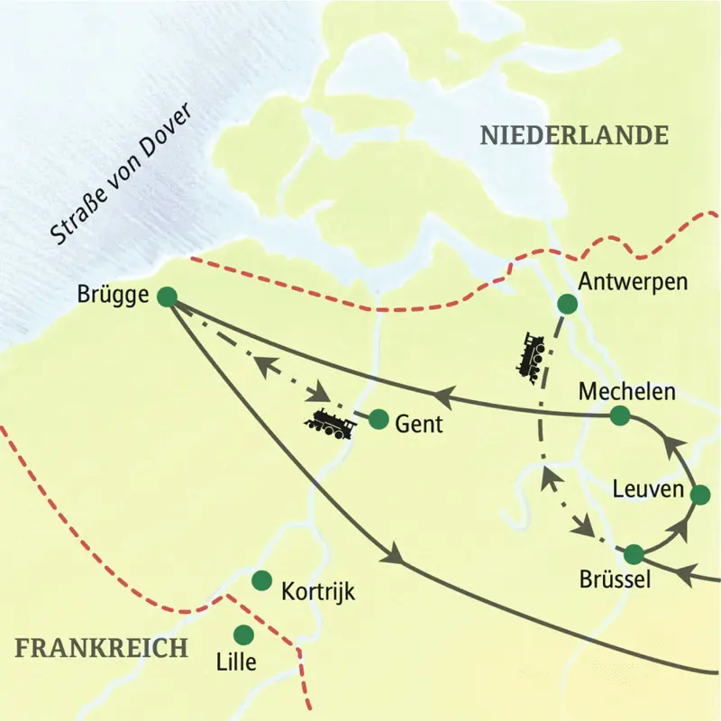 - Zugfahrten von Brüssel nach Antwerpen und von Brügge nach Gent und zurück in der 2. Klasse