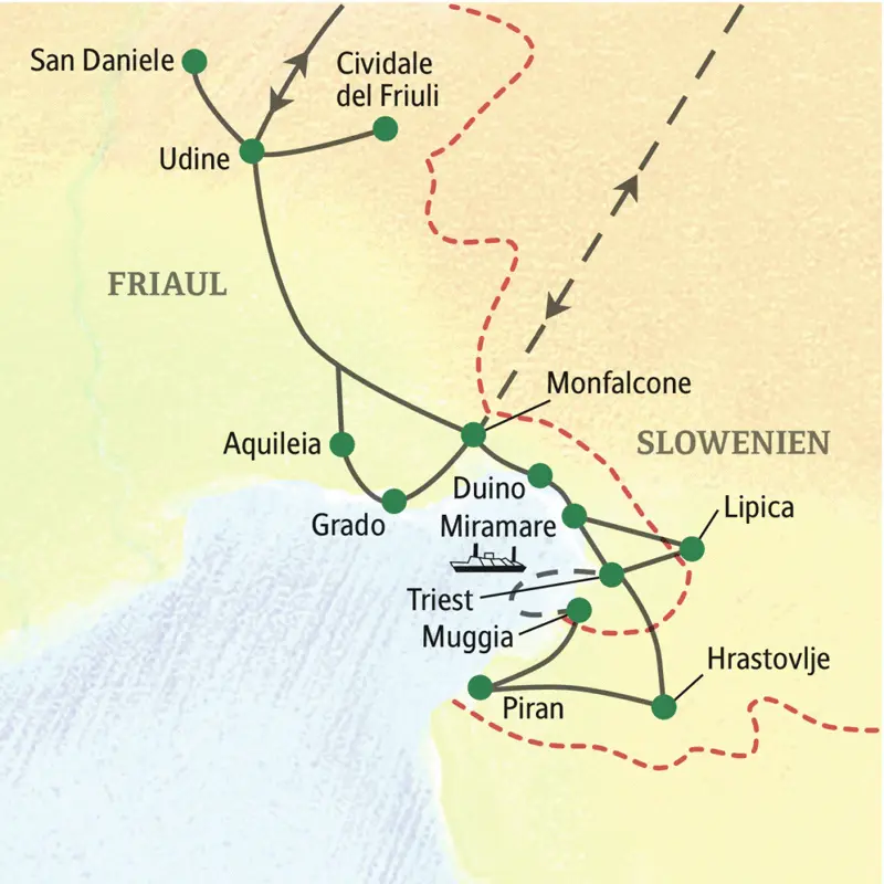 Sagen Sie es nicht weiter: Im Nordosten Italiens, wo das Alpenvorland Slowenien erreicht, sind alle Reize des Landes versammelt – das Meer, die Berge, der bunte Mix der Kulturen. Im Dreieck Udine, Aquileia, Triest spüren wir spannende Kunstschätze auf. Nur einmal wechseln wir dabei das Hotel. Langobardische Kirchen, römische Mosaiken und dann in Triest die k. u. k. Mischung: mit royalem Glanz auf den Schlössern Duino und Miramare. Wir wandeln auf den Spuren Rilkes und können uns nicht sattsehen an der herrlichen Bucht von Triest. Entdecken Sie auf dieser Studiosus-Reise auch die slowenische Küste und erliegen Sie dem Charme von Piran!